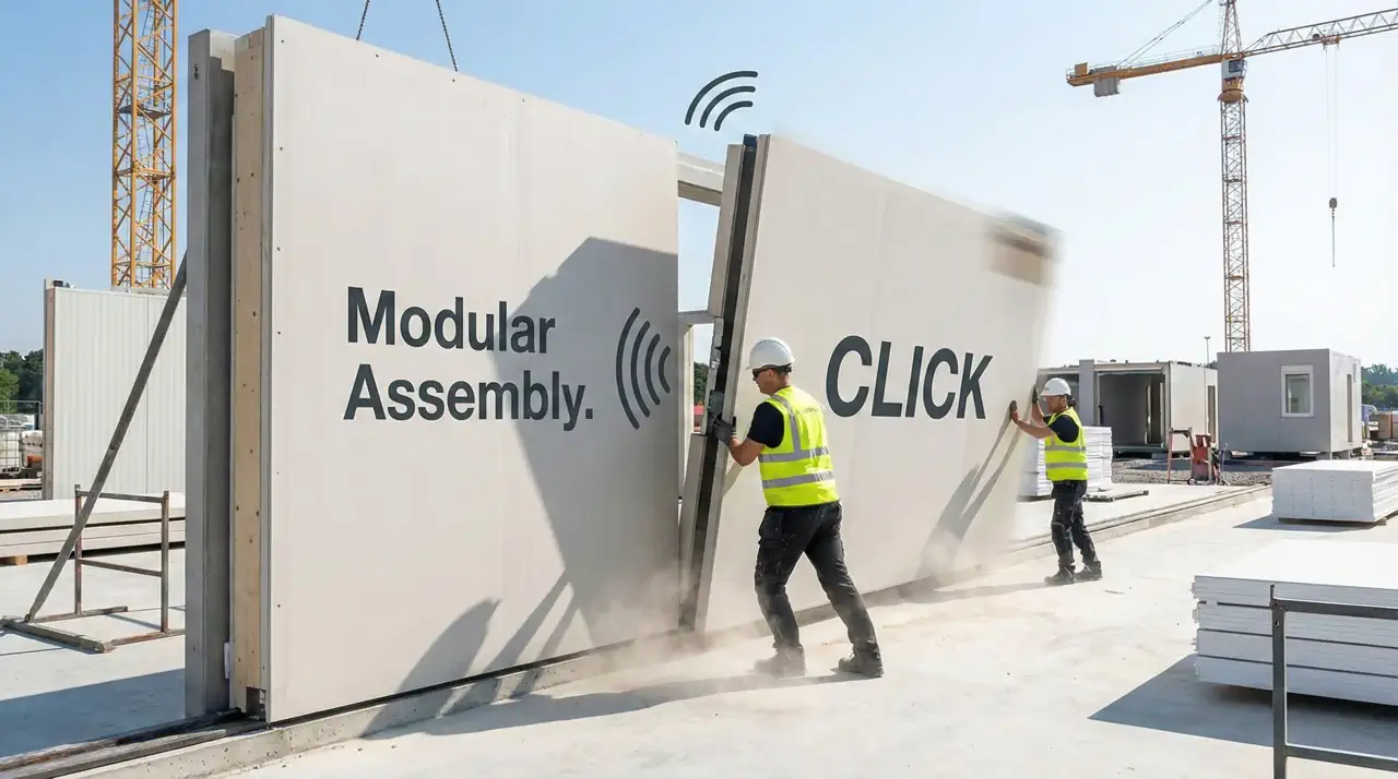Prefabricated wall panels slide and lock into place with structural certainty.